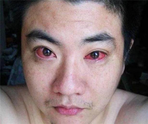 فقد بدأ يلاحظ عدم قدرته على الرؤية بوضوح، إضافة إلى ظهور بقع حمراء تغطي كامل عينيه.